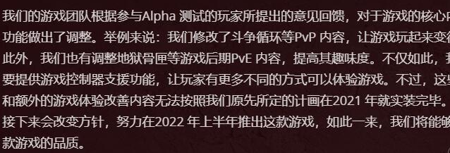 根据暴雪官方公开的消息,游戏团队根据参与Alpha 测试的玩家所提出的意见回馈,对于游戏的核心内容与后期功能做出了调整。这些改动项目和额外的游戏体验改善内容无法按照原先所定的计划在2021 年就实装完毕。因此,他们接下来会改变方针,努力在2022 年上半年推出这款游戏。