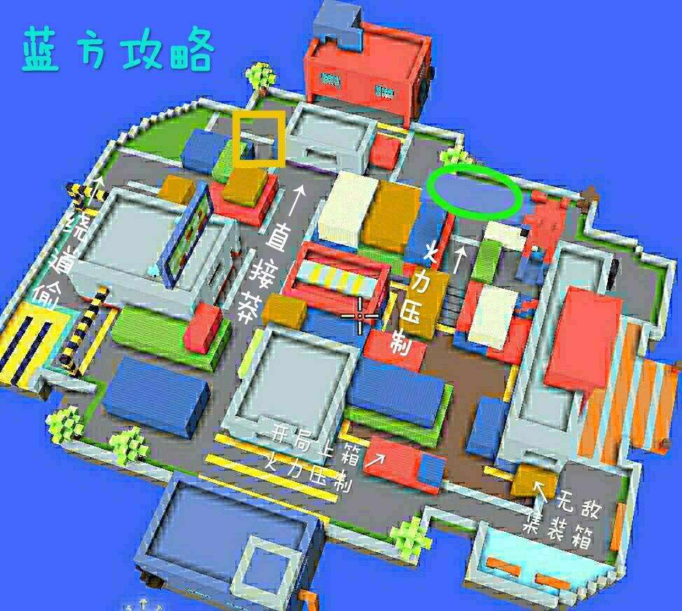 而开局我比较愿意到火力压制点(红集装箱)进行扫射,几乎每次都能扫到敌人一二枪,可以在血量上面取得微弱优势,也可以在下水道的蓝色集装箱(见下图)进行抛雷,对绿色圈位置进行雷区轰炸,有一定概率炸残敌人。
