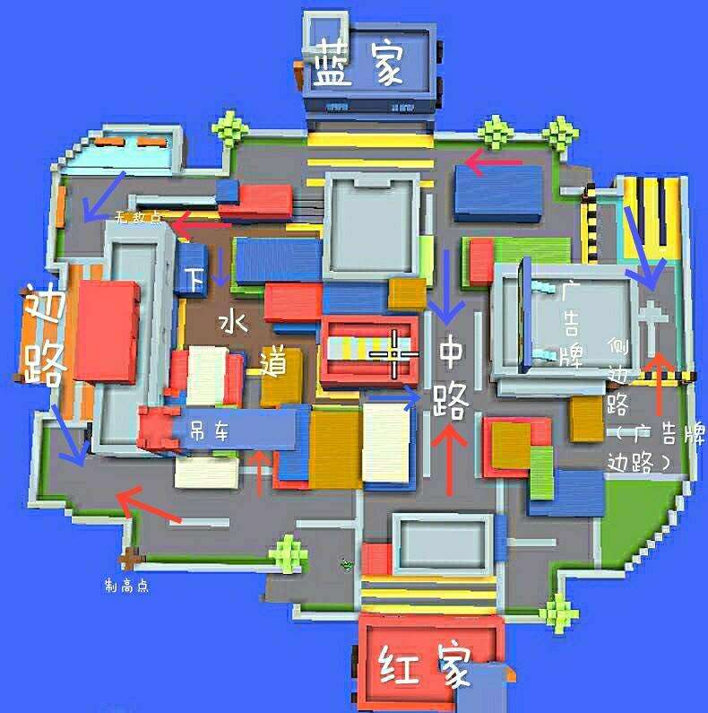 蓝方因地处高处,地形较高,有多个上房点位,属于优势的进攻方,如果你是蓝方的队员,那么你可以暗自窃喜了,处在蓝方就等于掌握了主动权,作为进攻方,有以下几条路线。