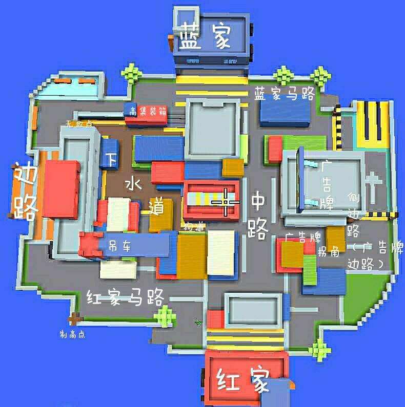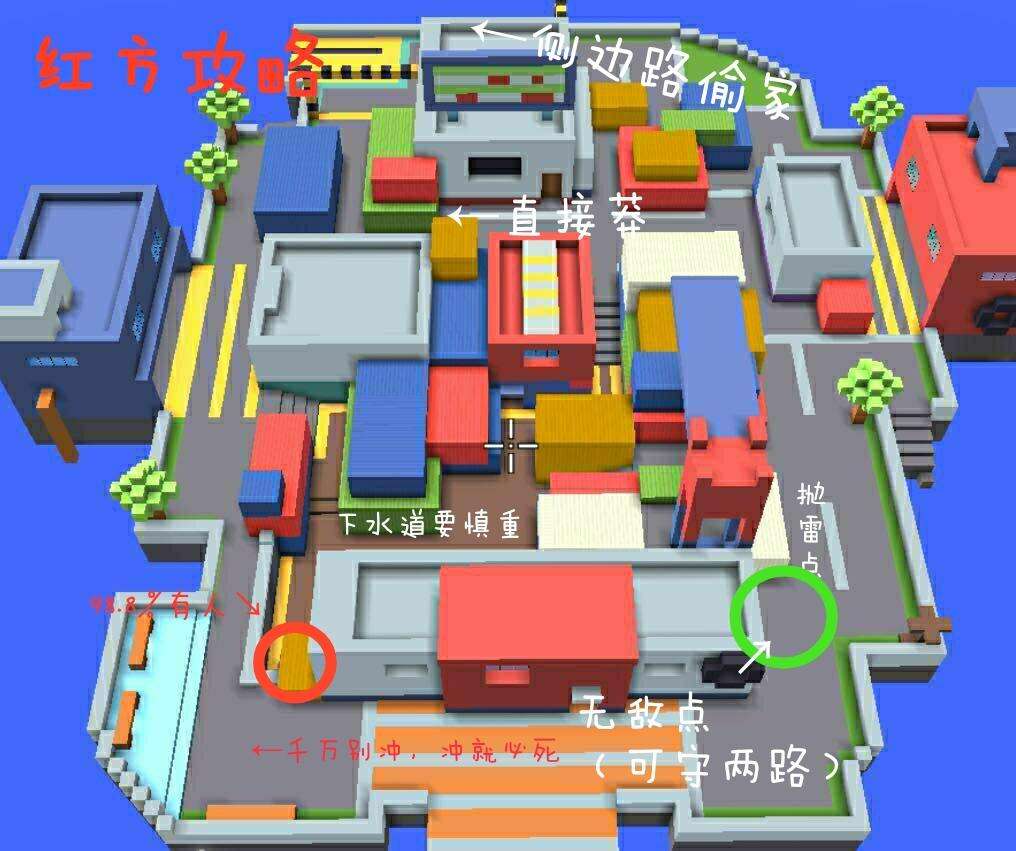 先从红方说起,红方属于地势低平的一方,并且没有能够上房的位置,所属劣势方,而且不管是从边路冲还是侧边路偷,都没有地形与掩体优势,所以红方想赢不能冲动,要进行防守。