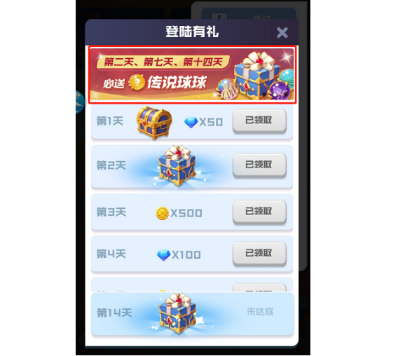这个大家应该都有注意到,在游戏右侧方的【十四日登录】福利活动中,玩家分别可以在2、7和14天获得一个包含传说球球的【传说礼包】。