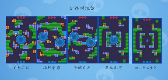 我们先来看一下合作对抗组,共有四张地图,分别是金色兵团、摇杆争霸、斗域奇兵和其乐无穷。