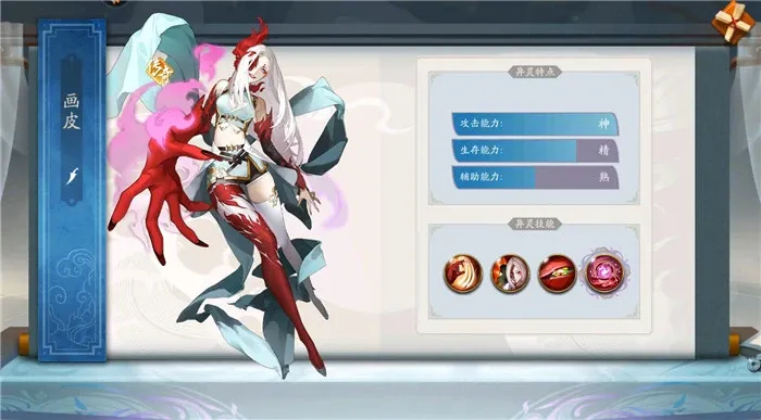 画皮是玩家主线任务赠送的角色,技能鬼爪可以瞬移到最远的敌人身边,对其附加流血效果,并降低防御,大招噬骨是使用2次鬼爪技能,第三次鬼爪会对所有的敌人造成流血伤害,被动不仅有吸血效果提升生存能力,而且还会增加其闪避和暴击率。所以当进化到神话解锁大招之后画皮的能力会大大提升,是一个后期必备的切后排英雄。