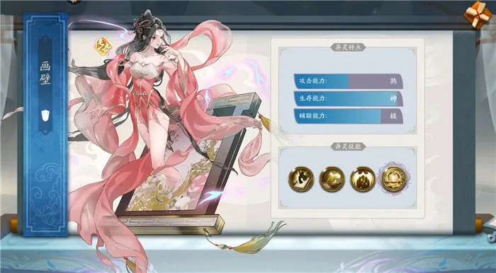 这是游戏预约赠送的一个传奇异灵,别看其外表柔弱,但是辅助能力绝对排第一,1技能是全体加护盾,基本可以挡住敌人第一波的攻击,大招是在使用3次1技能舍身后,第三次会提升所有队友的输出伤害和伤害减免。这两个主动技能可以大大增加我方的生存空间和输出能力。她的1被动技能有反伤的效果,2被动生命值越少防御和伤害减免越高,提升了自身的生存能力。有了画壁的队伍基本不用带奶妈就能够使队伍的生存能力大大增加,非常适合在PK中使用。