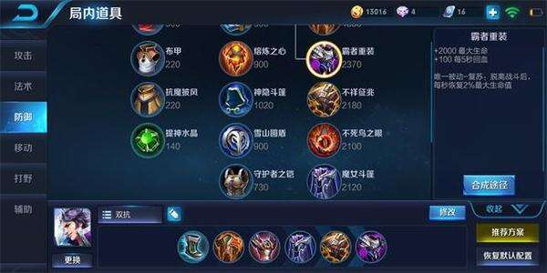 出装推荐:抵抗之靴+红莲斗篷+反伤刺甲+魔女斗篷+不祥征兆+霸者重装