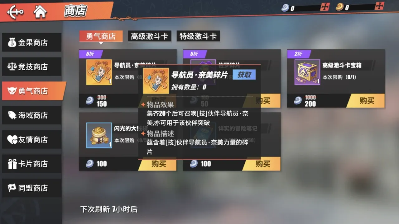 勇气商店——可以使用勇气点数来购买S级伙伴导航员·奈美的碎片,收集20个即可召唤S级技类型伙伴导航员·奈美,这是获得S级伙伴的一个便捷方式。除此之外还能兑换佐罗碎片、高级激动卡宝箱等奖励。