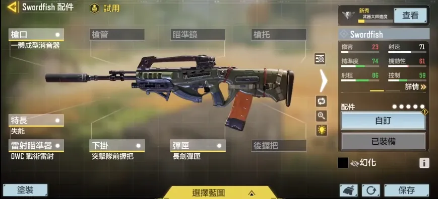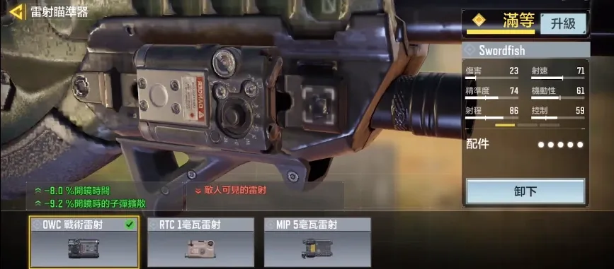 下挂配件方面,考虑到剑鱼更适合中近距离作战,这里选择的是OWC战术镭射。该配件的镭射光虽然可见,但是可以更好地提高腰射精准度,辅助瞄准效果非常强力。借助OWC战术镭射我们在实战中就可以不用频繁开镜,增加容错率。