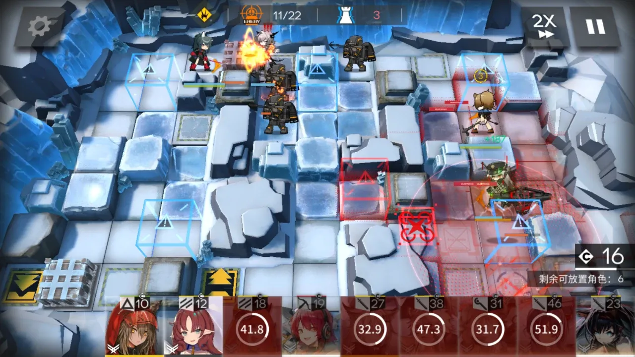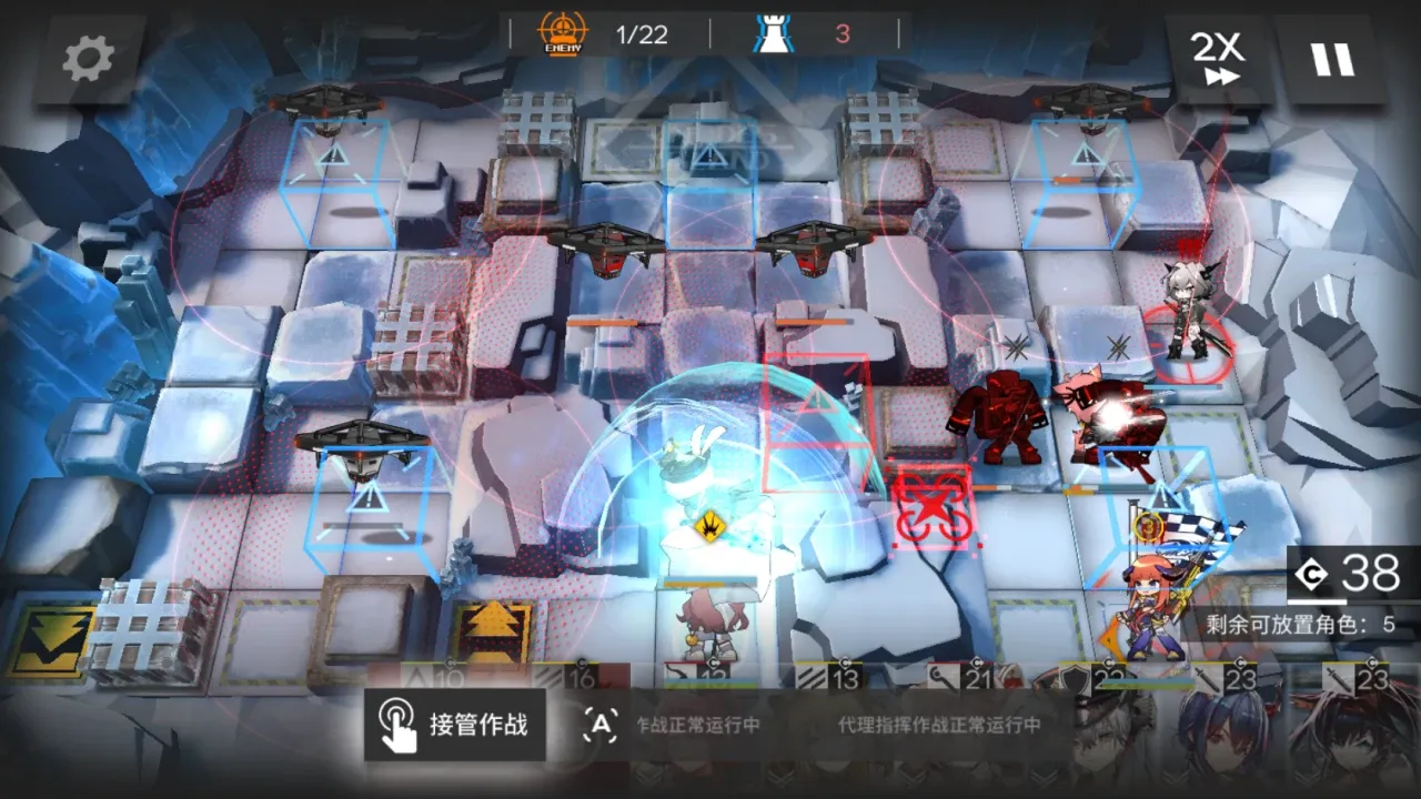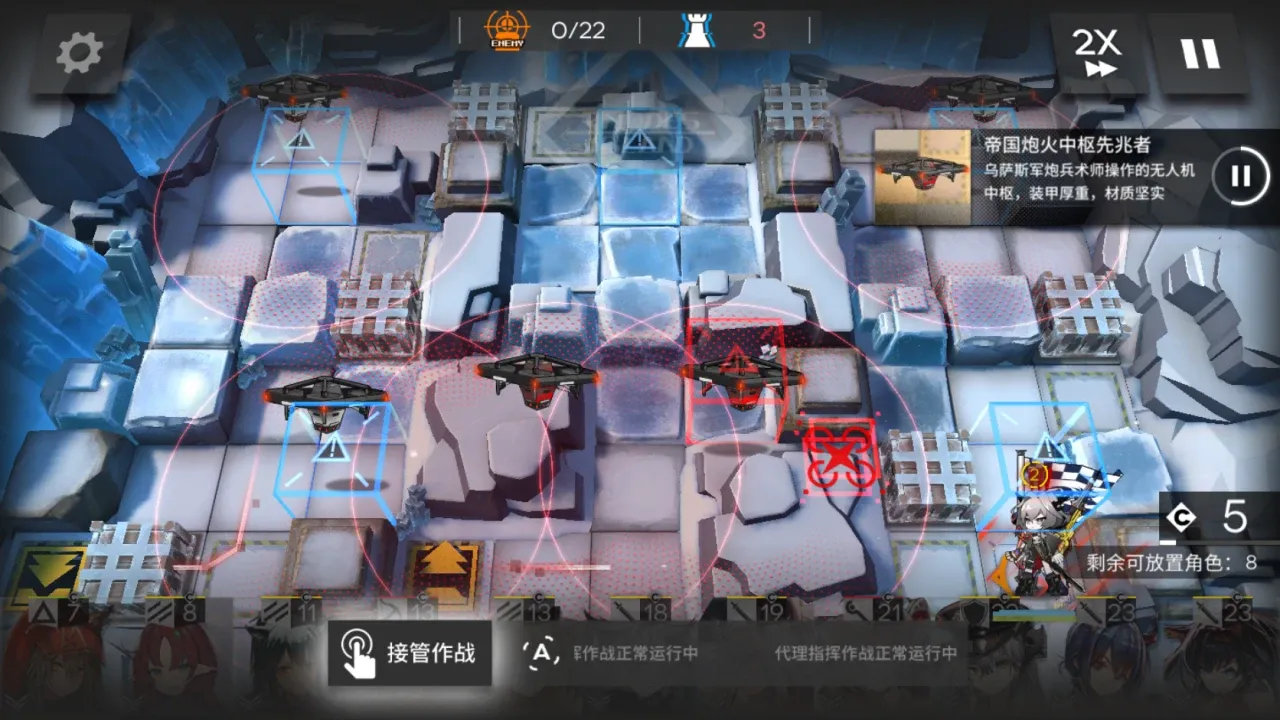 进入到关卡后,我们可以看到地图上开局就分布着大量的先兆者无人机,而NPC塔露拉的行动轨迹被方块阻挡,这里一定要等到无人机被打掉后再清理方块,避免塔露拉吃到伤害而掉到半血以下。