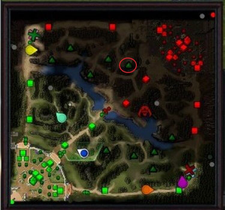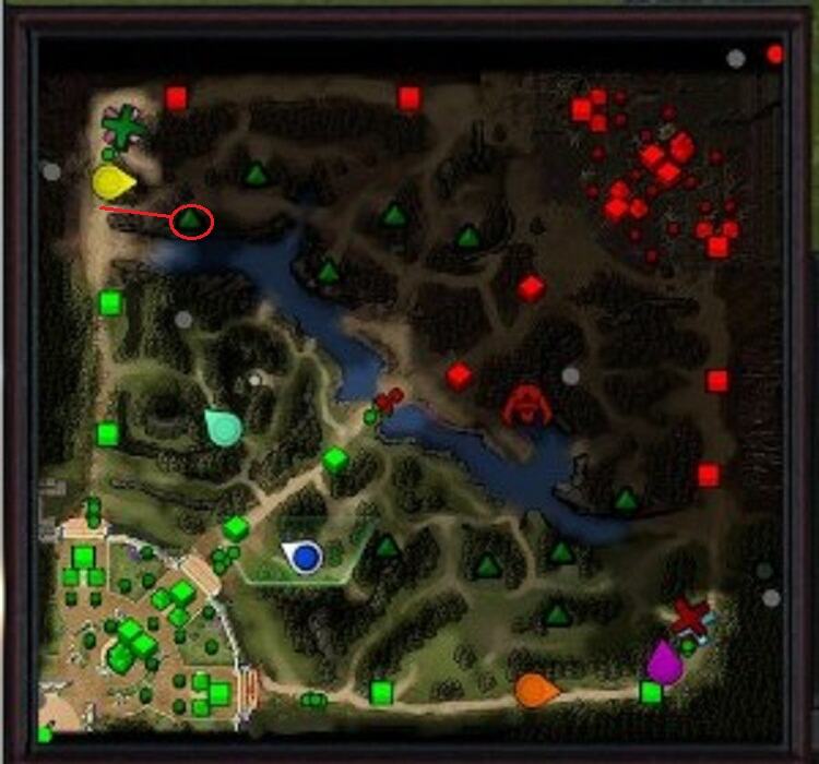 砍掉如图的这颗树,并在15秒或45秒时拉野,可以将里面的大怪拉出,阻碍天辉方小兵的前进(你此时是天辉方的玩家)。路线如下图:
