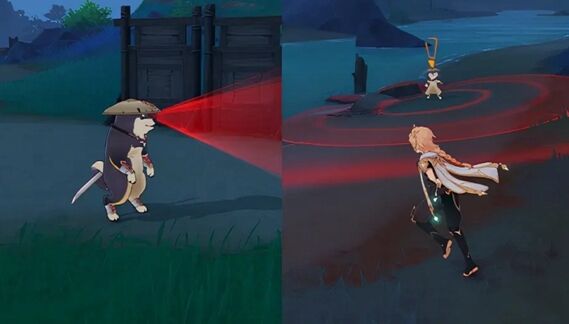 忍犬,与其他犬类小动物类似,接近时会跟随旅行者,不过其他犬类遭受攻击时会避开逃离旅行者,它则是尝试使用手中的刀具,格挡旅行者的攻击。注:图上的忍犬之所以在大世界,单纯只是为了方便演示,实际上并不可以带入大世界。