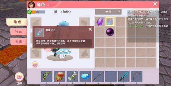 经过我们的努力终于打败羽蛇神啦!这些就是击败羽蛇神掉落的东西,蛇神之羽可以用来合成蛇神之翼,可用于滑翔。雷电晶核可以配合法杖合成雷电法杖。