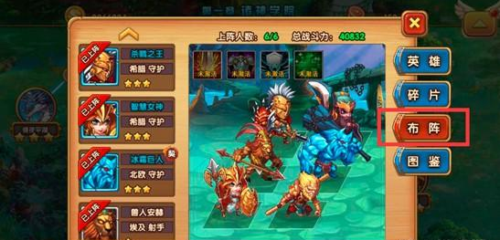 点击进入到的是英雄控制界面,接下来点击该界面中的“布阵”按钮,可进入到英雄的布阵界面,可以把现有的英雄进行排列布阵,每局最多可上阵6个英雄,分上路、中路、下路三路出兵,如下图: