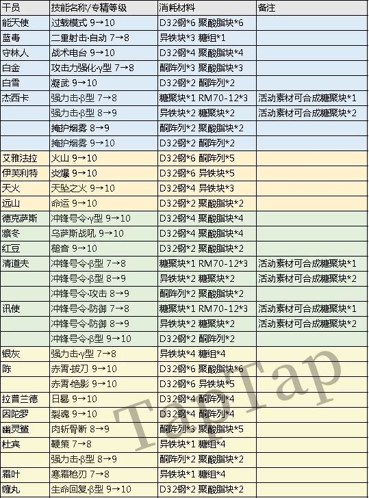 这里统计了活动素材可直接精二的干员名单以及可升级的专精技能,希望对大家有帮助!