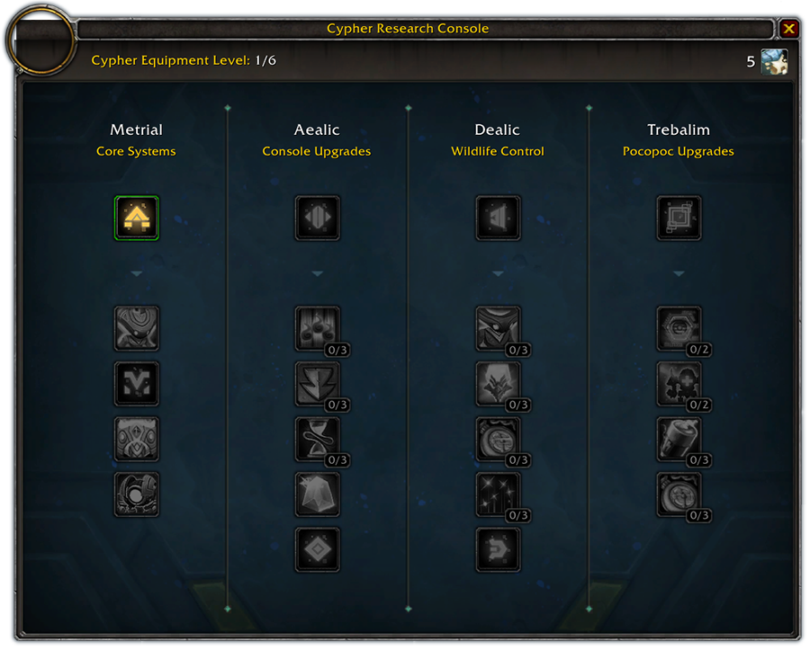 但现在实际能调出来的控制台界面是有所不同,可以看下图。控制台最上面有密文设备等级字样,共有6级,1级升2级需要740个新货币“初诞者密文”。提升等级可以提升控制台的效率。控制台天赋树目前可以看到有4列,解锁它们当然也需要新货币(几十到几百)和时间。