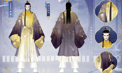 成男少侠半束秀发,头戴金色玉兰花枝发簪。宽袖外袍之上装点着金色的玉兰枝叶,搭配腰间缀着玉兰花瓣的腰带,更显潇洒。