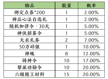 2910R总共获得(光单次抽取物品,不算兑换,不算次数奖励):91个天衣礼券,5W5帮贡,2000W碎银,600个铸神令,330个神魄,9个金色心法,25个神侠招募令,1300个6级精工,25个面饰以及574个棋局碎片。面饰为30天但是可以叠加天数。