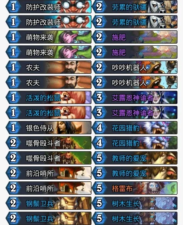 这套铺场德开局直接铺场,然后利用随从钢鬓卫兵的效果,降低嘲讽随从2点费用。然后靠着卡组中树木生长,在施加群体Buff,提升阵容的站场和斩杀能力,最后龙艾露恩神谕者打出铺场的爆发。