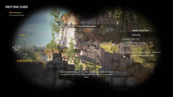杀死敌人后,从柱子下方爬至上方平台,出现教程提示,按B打开望远镜将远处的两个敌人与1个吊钩标出,再按B退出望远镜。