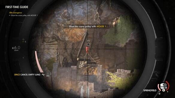 按鼠标右键瞄准刚才标记2个敌人上方的吊钩,等待两个敌人的位置在吊钩下方,将吊钩击断,掉落的吊钩将能同时杀死下方的两个敌人。