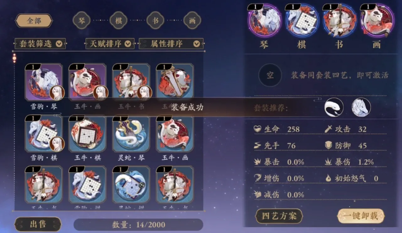 关于四艺方面的抉择,优先推荐银涛和御苍,这两个套装对于PVP玩家或是PVE玩家都有着不错的加成,性价比非常高。且这两件装备可以很好地提高输出位的上限,获得的渠道也有相通点,可以高效率地获取关键装备道具。