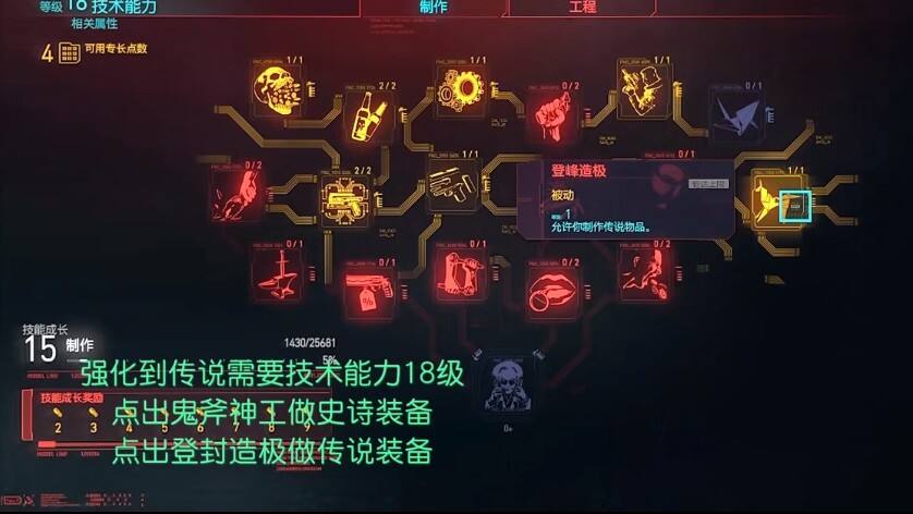 在赛博朋克2077游戏中,玩家进行武器升级到传说需要技术能力18级,点出鬼斧神工可以制作史诗装备,点出登峰造极可以制作传说装备。