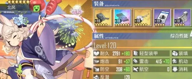 属性:面板上炮击值91+57,后边翻页又有舰队高新科技,换句话说很直观的能发现属性。