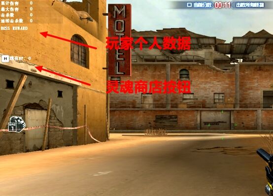 该挑战没有小地图可以观察(这一点是也是非常贴合保卫者卫星被Blitz击落的设定),不过好在地图并不复杂。进入游戏后,左上角界面显示有玩家个人的击杀数,死亡次数以及伤害。下面是灵魂点数商店(按H键打开灵魂商店)。