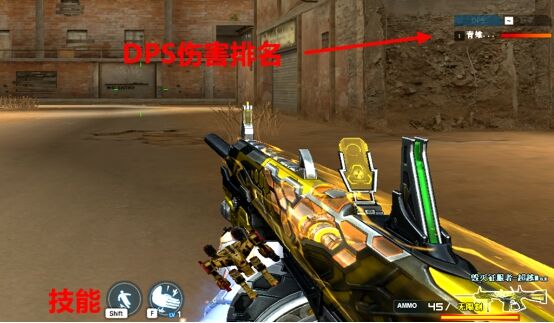 屏幕正下方是玩家可使用的操作:滑行以及灵魂技能。右边则是首次引入了直观的“DPS(伤害统计)”系统,玩家们可以在这里清楚的看到每个人造成的伤害以及房间内玩家的排名。按~键自由切换玩家伤害信息与房间内玩家的排名系统,非常方便。