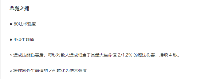 恶魔之拥:生命值转换为法强,如果有半肉卡特的玩法,可以出,常规玩法不建议出。