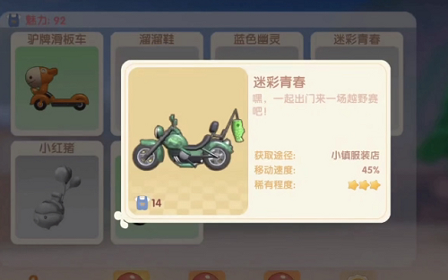 2、进入小镇后,玩家需要与服装店老板进行对话即可进入服装店购买界面,在物品栏中即可看到迷彩青春载具了。