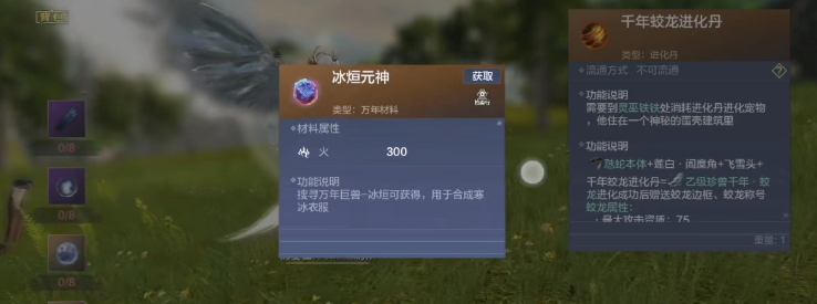 千年蛟龙:千年需要虺蛇本体+飞雪头+莲白闾糜角+千年蛟龙进化丹