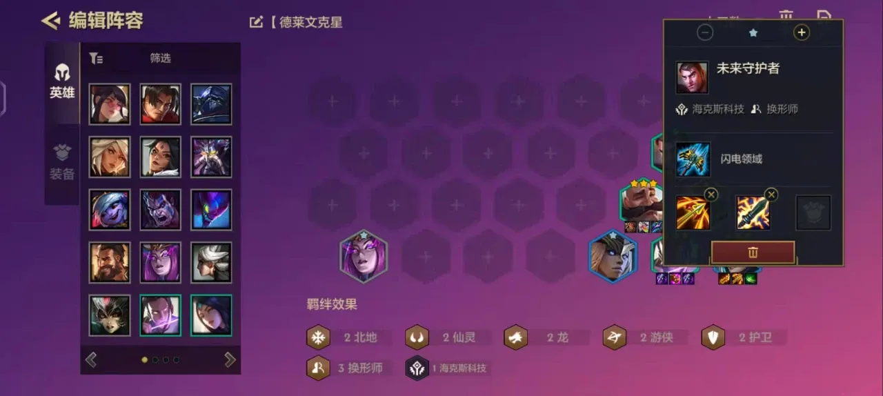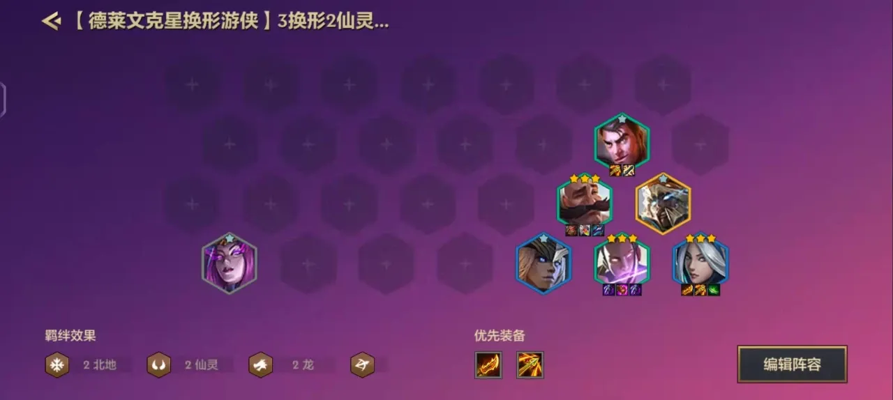 3、中期因搭配:中后期基本成型2个仙灵、2个北地、2个游侠、3个换形师。此时可以快速选出星龙战神和逆鳞战姬了。