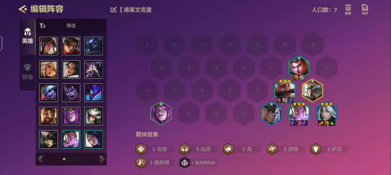 1、阵容羁绊:2个仙灵、2个龙珠、2个北地、2个护卫、2个游侠、2个换形师。
