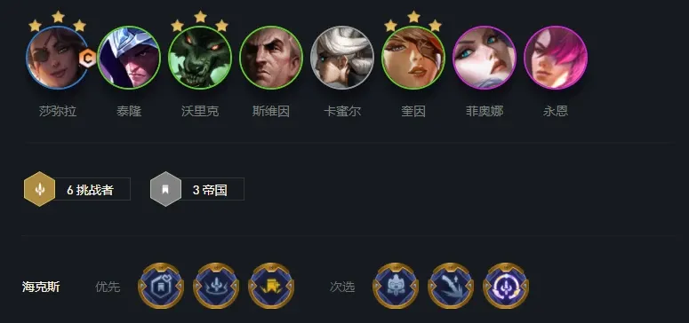 阵容只需要8人口就能成型,组成成员有:莎弥拉、男刀、狼人、乌鸦、卡密尔、奎因、剑姬、永恩。阵容触发的羁绊比较简单,6挑战者和3帝国。这两大羁绊可以同时强化到莎弥拉,让莎弥拉的基础强度得到提升。莎弥拉的攻击距离可远可近,应对不同距离的敌人可以采取不同的攻击手段,最大程度上节约了输出时间。装备上建议选择破甲弓和无尽,可以将爆发伤害强化到极致,最后一件可以选择正义之手补容错。