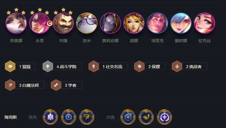 该阵容由剑姬、永恩、布隆、猫咪、发条、风女、塔里克、日女、拉克丝组成,一共需要九人口,可以触发4战斗学院、2挑战者和3白魔法师羁绊。这套阵容对人口数量要求比较高,所以玩家们前期要尽可能地加快攒钱速度,运营以迅速拉满9人口为主。该阵容输出C位为永恩和剑姬,永恩可以给鬼刀、水银和泰坦,剑姬则是选择携带法宝搭配无尽,可以更好地打出超高爆发伤害。