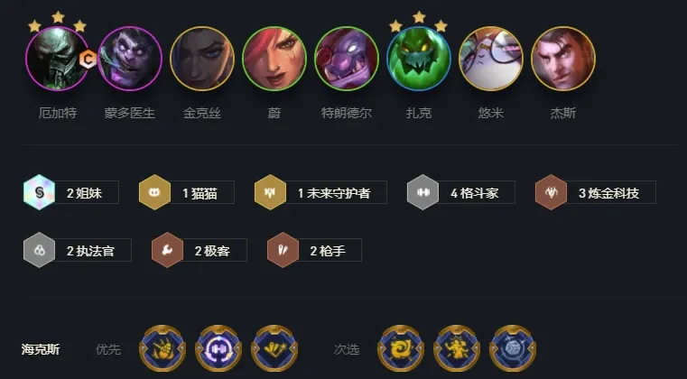 该阵容8人口就能成型,上阵厄加特、蒙多、金克丝、蔚、巨魔、扎克、猫咪、杰斯。该阵容是常规的后排持续输出玩法,前排由格斗家来抗伤害,给后排的枪手们创造更多的输出时间和启动时间,是比较常规且高容错率的T0阵容。团队主C为金克丝和厄加特。金克丝给法系装备,提高技能爆发伤害。厄加特需要持续输出,带飓风、鬼刀、无尽、破甲弓、巨人杀手等常规AD装就行。