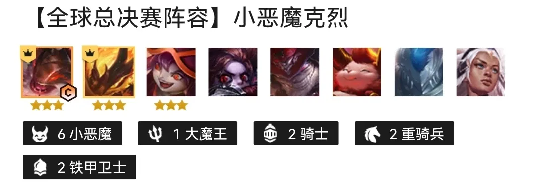 今天小编带来的这套克烈主C阵容的组成如下:主C克烈,凯南,露露,波比,炸弹人,提莫,泰坦和芮尔,这样的阵容组合可以组成的羁绊效果为6小恶魔,一个提莫带有的大魔王效果,两骑士,两重骑兵,两铁甲卫士,羁绊效果还是非常强力的。