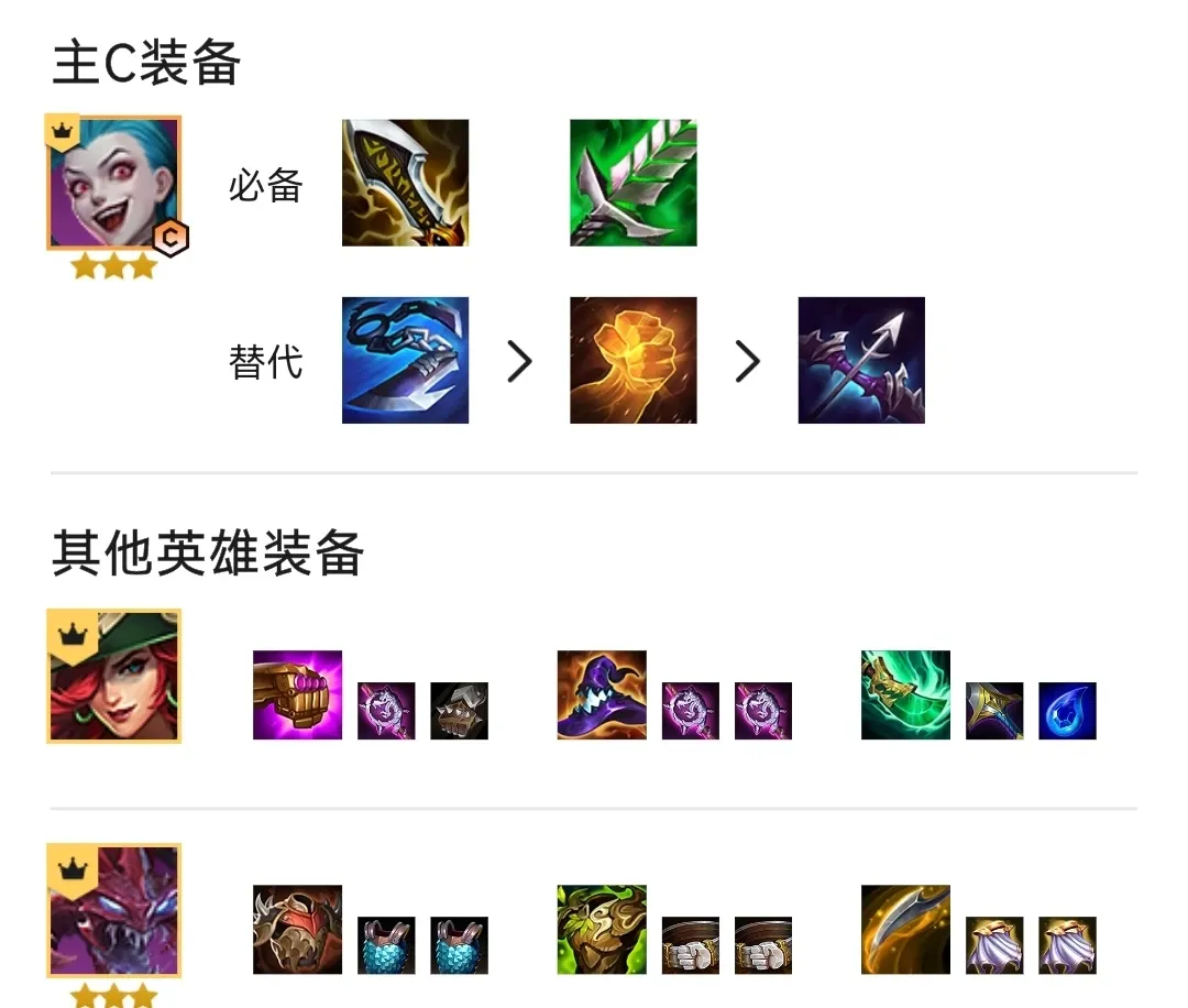 我们这套阵容是需要金克丝作为主C的,所以我们在抢装备的时候需要优先考虑金克丝的装备选择,选择大剑,攻速,拳套这样的装备。之后的话我们可以给金克丝合成无尽之刃,饮血剑,剩下的装备选择巨人杀手,正义之手或者破甲弓都是可以的。其余的英雄可以给女枪给到法强装备,大虫子给到肉装在前排吸收伤害打出控制就好了。