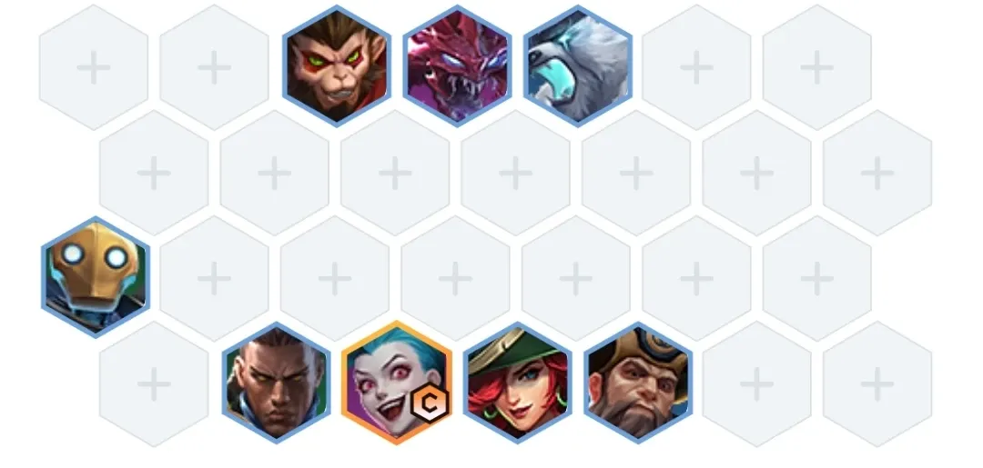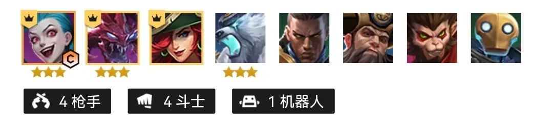阵容由金克丝,大虫子,女枪,狗熊,卢锡安,船长,齐天大圣,机器人组成,阵容的划分非常明确,有前排有输出,组成的羁绊效果为四枪手,四斗士以及一个机器人自带的机器人羁绊效果,虽然羁绊简单,但是这套的阵容强度是一点都不弱的。