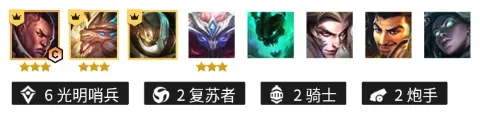 阵容羁绊:六光明哨兵两复苏者两骑士两强袭炮手。