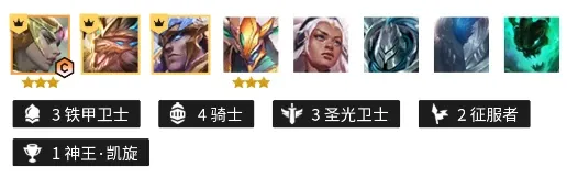 阵容羁绊:三铁甲卫士四骑士三圣光卫士两征服者一神王。