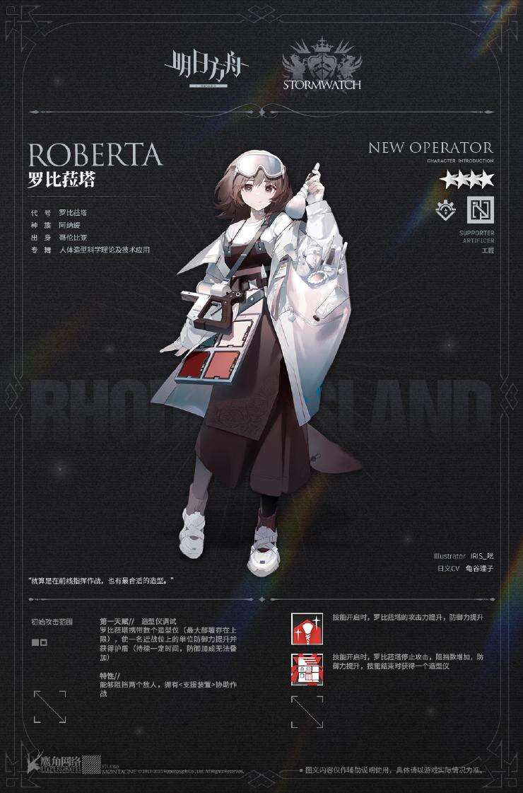 罗比菈塔携带数个造型仪(最大部署存在上限),使一名近战位上的单位防御力提升并获得护盾(持续一定时间,防御加成无法叠加)