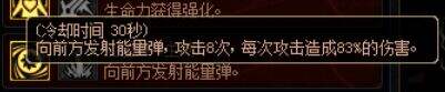 二星级别点出:能量弹,主动技能,CD30秒;向前方发射能量弹,造成8次攻击,每次造成83%的伤害。