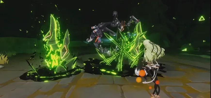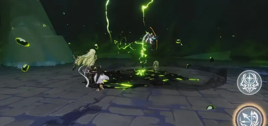 新角色噬界之蛇的存在着多种分支攻击,但是由于她有着独特的起源之种机制,因此实战中的连招并不算复杂。游戏中噬界之蛇在战斗时可以获得名为“起源之种”的道具,就是上图中屏幕下方的绿色种子,噬界之蛇在释放分支技能时需要消耗起源之种,而她的强化普攻,普攻第四段以及极限闪避在触发时会获得起源之种,最多获得三个,这就构成了噬界之蛇连招的基本思路。
