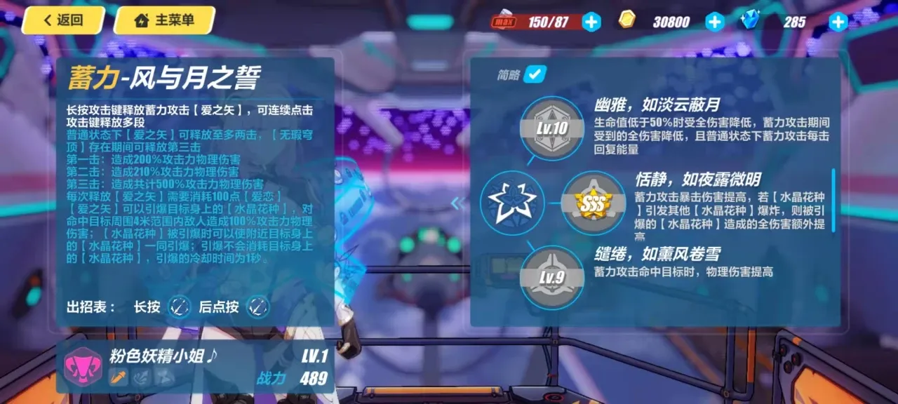 粉色妖精小姐的特殊技能风与月之誓,这是一个非常强力的伤害技能,在经过蓄力之后,可以释放出连续的多段技能,其中第一段可以造成200%攻击力的伤害,第二段造成210%攻击力的伤害,在第三段可以造成500%的伤害,所以说但从伤害总量上就已经非常恐怖了。而且还可以引爆伤害目标身上的标记,造成一次伤害,而且即使是引爆之后,目标身上的印记还不会清除,所以触发的频率也是很可观的。