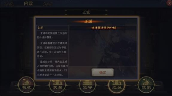玩家可以通过迁城的功能,将主城迁移至分城的位置,来达到调整主城位置的目的。