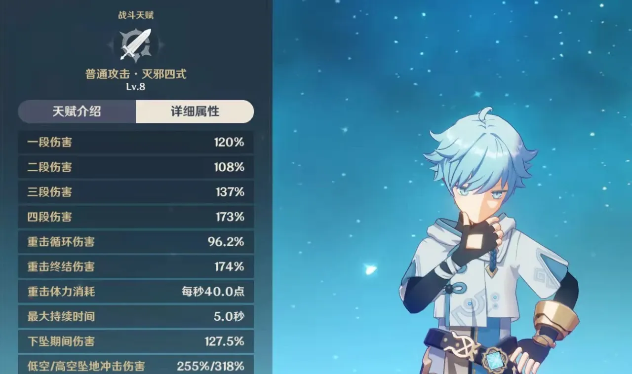 元素爆发:灵刃云开星落,在空中召唤出3把巨型灵刃瞬间砸向目标造成冰元素范围伤害。满命座后可以召唤出4把。大招只需要40点元素能量。冷却时间20秒,能够短时间高频率的打出大招。