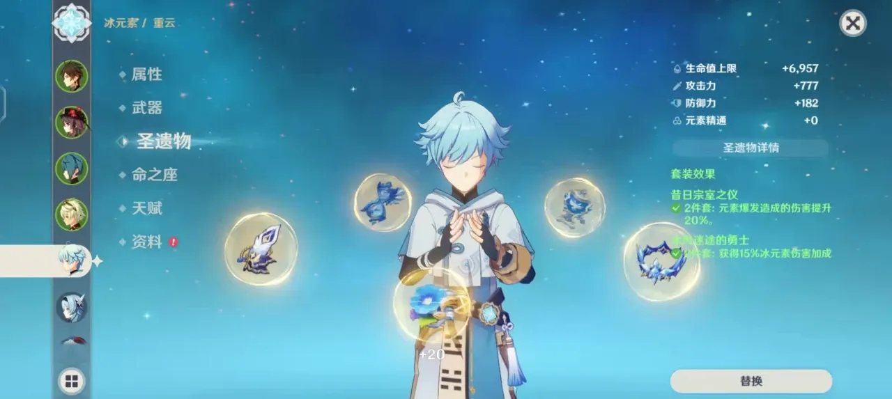 不过在大世界中重云玩起来还是比较舒服的,一般雷神+钟离+班尼特的BUFF加持之后,重云大招一下每把巨型剑都能打出3万以上的伤害,在跑图刷材料时候是可以一套秒过去的,期间可以和雷神循环开大,两人都是高充能类型。