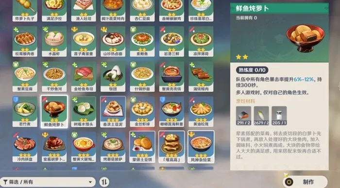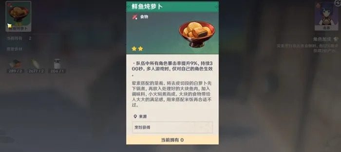 鲜鱼炖萝卜的料理效果是可以在300秒内增加所有角色的暴击率,而在我们使用香菱作为烹饪角色时不仅有几率获取完美料理完美的鲜鱼炖萝卜,也是有12%概率做到双倍产出的。而鲜鱼炖萝卜对于暴击率的加成按照成品的品质从劣到优分别时6%、9%以及12%。