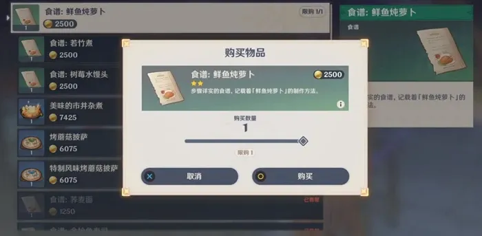 鲜鱼炖萝卜食谱其实是原神2.2版本更新后推出的新隐藏食谱,大家需要前往稻妻城木南料亭店主木南杏奈这里进行食谱的购买。鲜鱼炖萝卜食谱的售价为2500摩拉,除了鲜鱼炖萝卜之外,我们还可以购买到荞麦面、树莓水馒头以及若竹煮三个隐藏料理食谱。